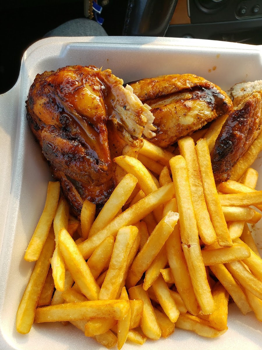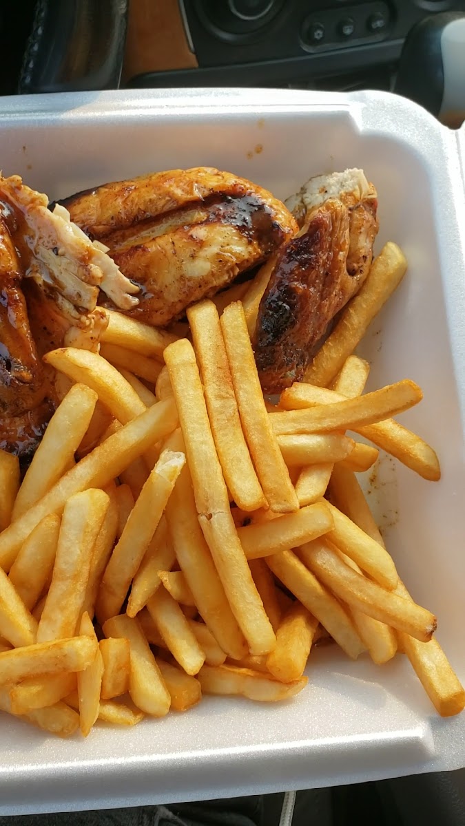 The restaurant is a go-to for those who appreciate generous servings—the plates come heaped with items like chicken back ribs, baby back ribs with roasted potatoes, or the classic chicken and salad combos. The charcoal grilling technique gives the chicken and sausages a smoky char that carries through in every bite, balanced by their signature mild sauce, often mentioned by regulars as a highlight worth taking home.